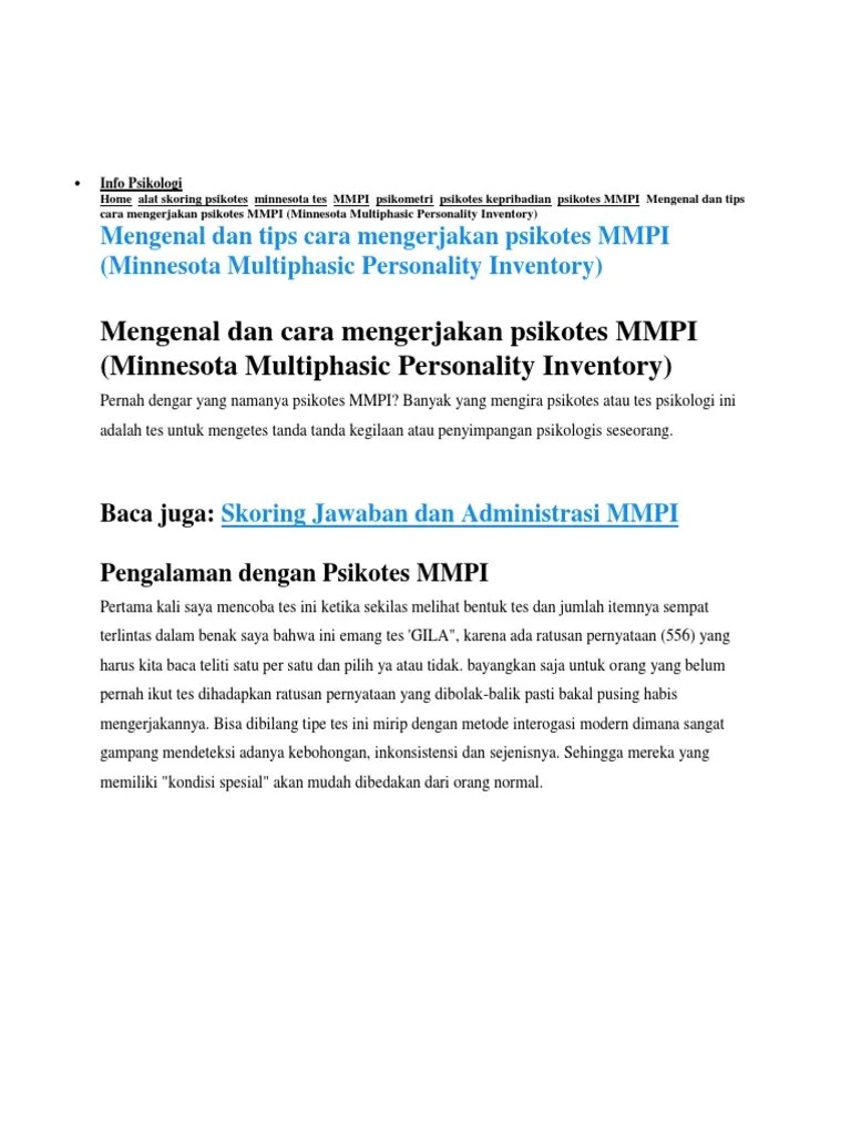 Lompati soal yang belum bisa anda jawab ke soal berikutnya, dan jangan terpaku terhadap satu soal. Jangan asal pilih, ini 3 jenis tes kesehatan mental dengan hasil akurat. Dalam tes mmpi ada 567 pertanyaan dan 1 lembar jawaban dengan 2 pilihan dan. Secara empiris item valid dipilih untuk menyusun konstruk mmpi. Banyaknya jumlah item pada mmpi menjadi salah satu kekurangan alat tes ini, termasuk salah satunya dalam prosedur skoring dan interpretasi yang dilakukan oleh tester.